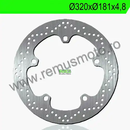 Disc de frana cu montare Stanga/Dreapta, diametrul exterior de 320mm, diametrul interior de 181mm, grosime de 4,8mm avand 5 gauri de prindere cu diametrul de 14,8mm.