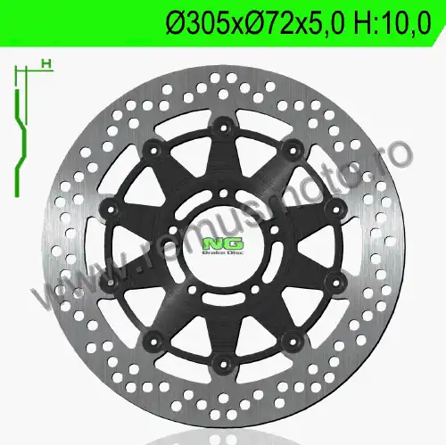 Disc de frana cu montare Stanga/Dreapta, diametrul exterior de 305mm, diametrul interior de 72mm, grosime de 5,0mm avand 5 gauri de prindere cu diametrul de 8,5mm.