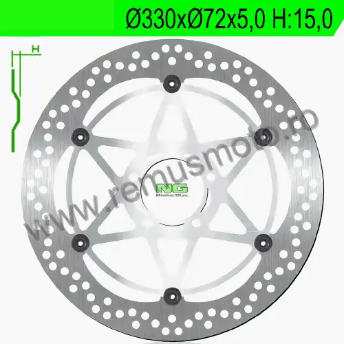 Disc de frana cu montare Stanga/Dreapta, diametrul exterior de 330mm, diametrul interior de 72mm, grosime de 5,0mm avand 5 gauri de prindere cu diametrul de 8,5mm.