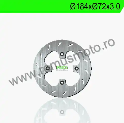 Disc de frana cu montare Stanga, diametrul exterior de 184mm, diametrul interior de 72mm, grosime de 3,0mm avand 4 gauri de prindere cu diametrul de 6,5mm.