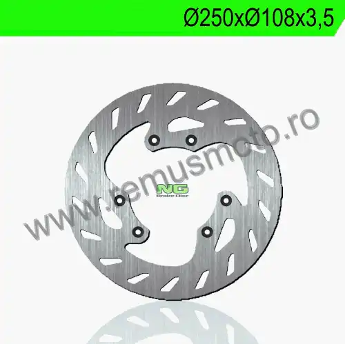 Disc de frana cu montare Stanga, diametrul exterior de 250mm, diametrul interior de 108mm, grosime de 3,5mm avand 6 gauri de prindere cu diametrul de 6,5mm.