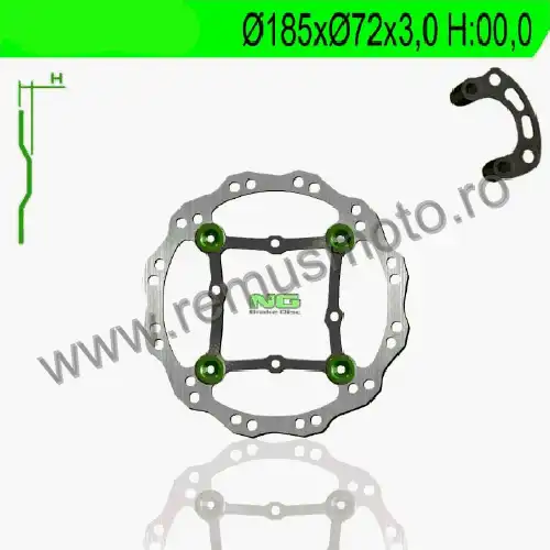 Disc de frana cu montare Stanga, diametrul exterior de 185mm, diametrul interior de 72mm, grosime de 3,0mm avand 4 gauri de prindere cu diametrul de 6,5mm.