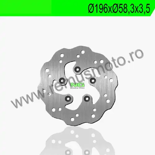 Disc de frana cu montare Stanga, diametrul exterior de 196mm, diametrul interior de 58,3mm, grosime de 3,5mm avand 5 gauri de prindere cu diametrul de 8,5mm.