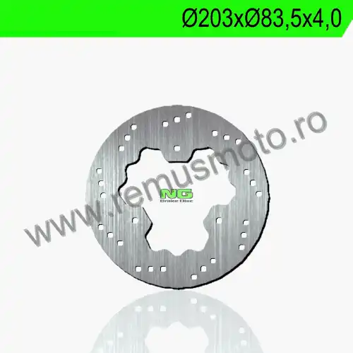 Disc de frana cu diametrul exterior de 203mm, diametrul interior de 83,5mm, grosime de 4,0mm avand 3 gauri de prindere cu diametrul de 8,5mm.